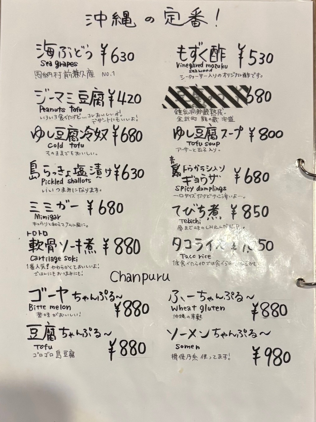 一番人気メニューのトロトロの「軟骨ソーキ煮」(880円)、脂っこさのない甘辛の「ボンジリ炒め」(680円)にお酒がすすみます。